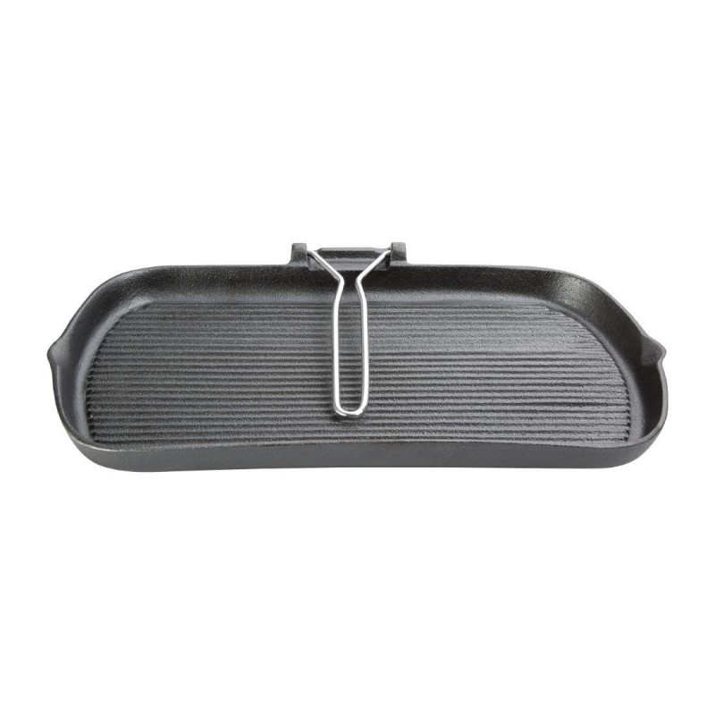 The Vogue cast iron grill pan is perfect for busy kitchens with heavy duty construction and a fold away handle to save essential space. With a spout at each side of the pan and ridges on the bottom fats and oils are easily drained away from the food allowing you to create the perfect seared finished meal with ease.
