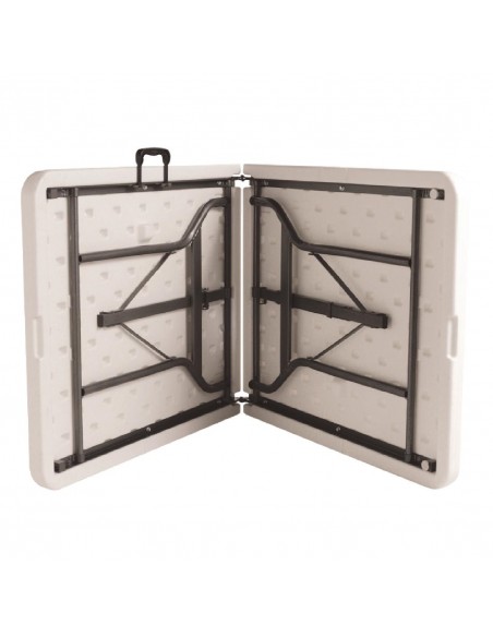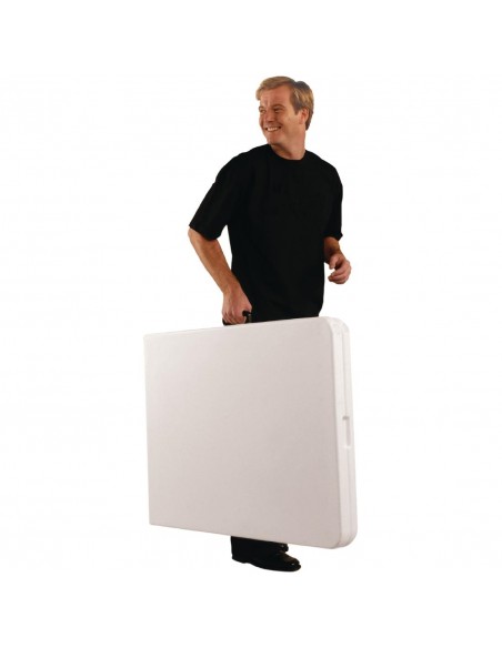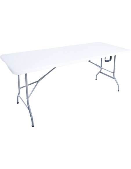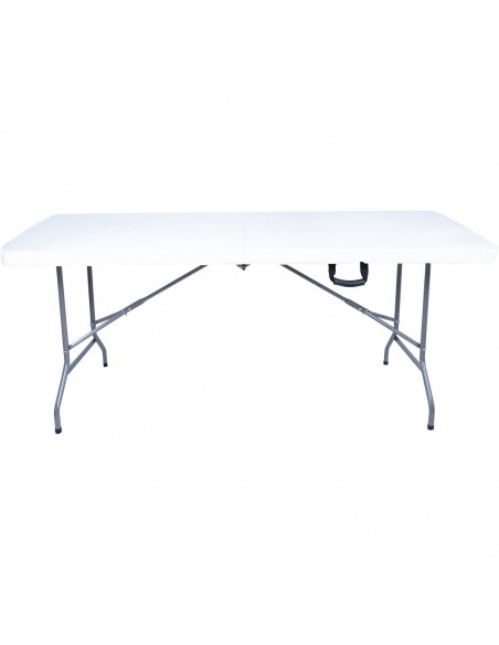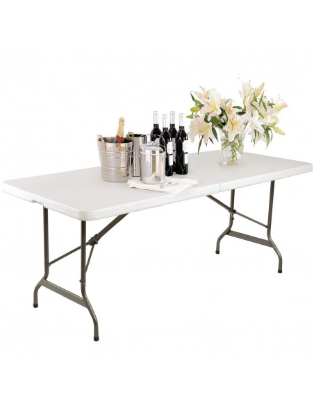Instantly create extra catering space with this strong and practical 6ft fold away table. Ideal indoors or outdoors for buffets parties banquets and weddings. Space saving easy to carry and simple to transport. This table is perfect for both indoor and outdoor use. It offers an ample size and classic granite white surface, and is easy to fold up and carry at the end of an event. Simply collapse the legs, then fold the table in half. It will lock together for safe, efficient storage and transport so you can carry by the handle or place it on a dolly. Unlock, unfold, and expand the legs when ready for your next engagement. With a high-impact polyethylene construction, it's resistant to cracking, chipping, or peeling as a result of routine use.