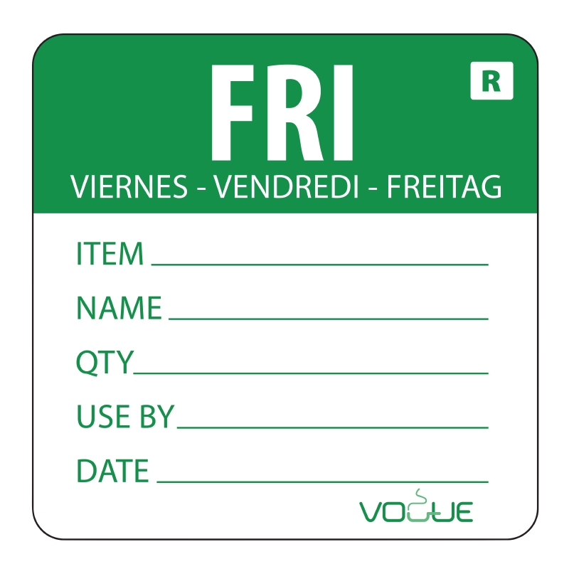Colour coded food safety labels to correspond with your day-of-the-week rotation system. See at a glance when food was prepared. Indicates use - by date on ready to eat foods. Easy to remove leave no residue. Supplied in rolls of 500. Available in individual rolls or a set of 7 rolls - one for each day. Label size: 49x 60mm.