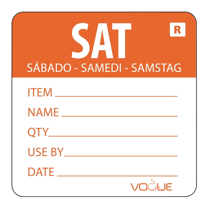 Colour coded food safety labels to correspond with your day-of-the-week rotation system. See at a glance when food was prepared. Indicates use - by date on ready to eat foods. Easy to remove leave no residue. Supplied in rolls of 500. Available in individual rolls or a set of 7 rolls - one for each day. Label size: 49x 60mm.