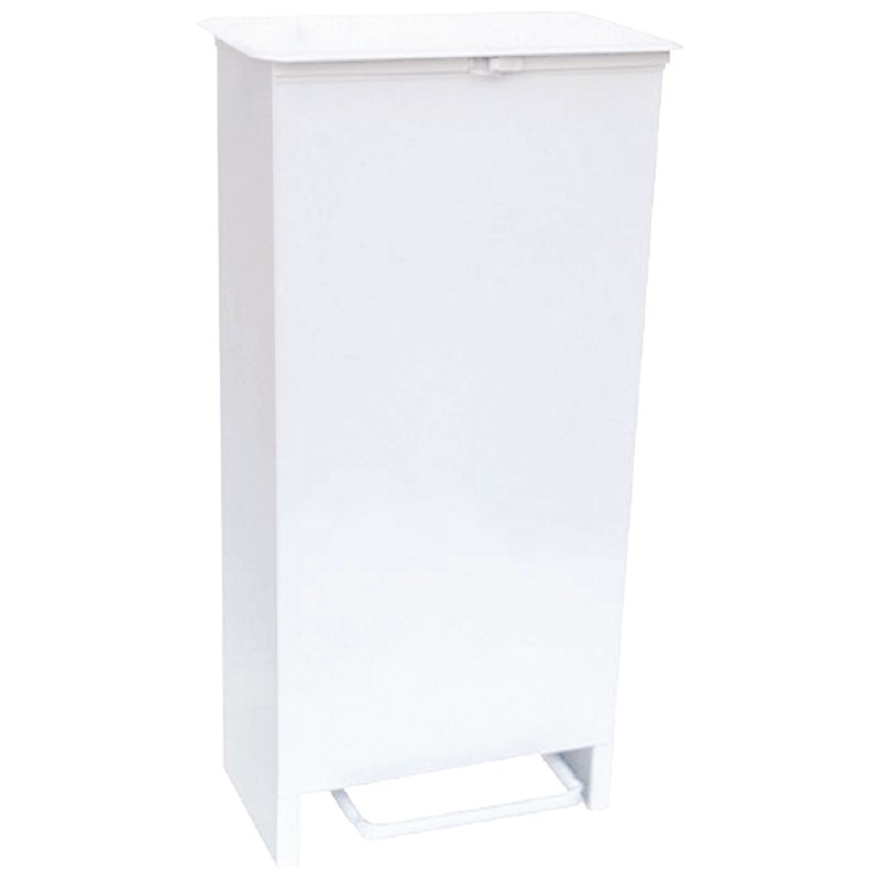 White painted all steel fire retardant construction with enclosed body and foot pedal operation sack trolley by Jantex.