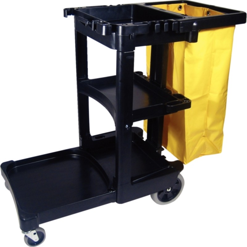 Janitorial cart with smooth easy to clean surface and swivel wheels for easier movement. Storage compartment tray built into top shelf of trolley for easy access to cleaning equipment or tools. Includes removable yellow vinyl bag for the collection and disposal of rubbish. Lockable cabinet (M896) available separately for the safe storage of chemicals or valuables.