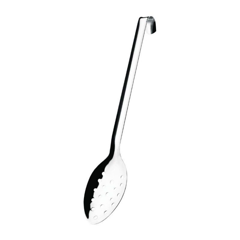 This Vogue perforated spoon is the perfect utensil for serving vegetables in busy restaurants and cafeterias. It is manufactured from high quality stainless steel for durability and can be stored easily thanks to the hooked handle.
