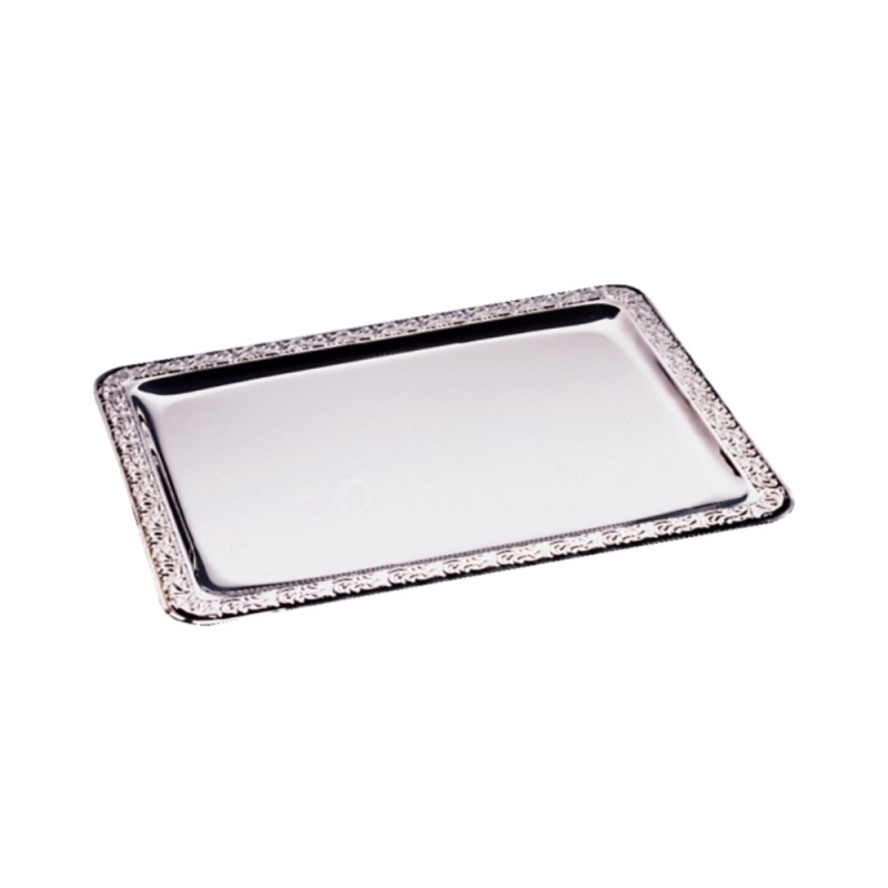 Ornate raised edge rectangular service tray by APS the perfect silver service tray for presenting and serving canaps during functions and events.