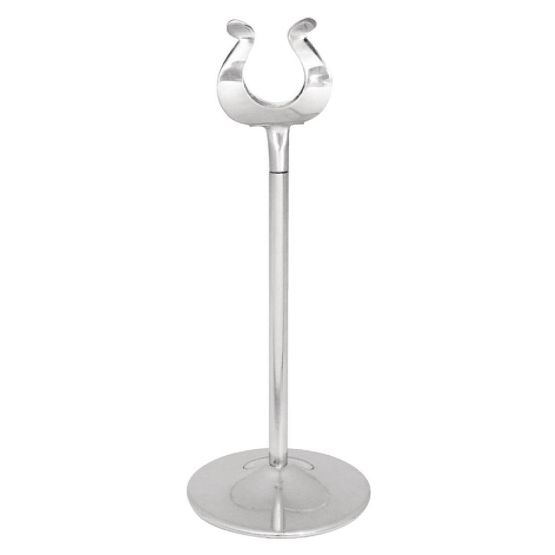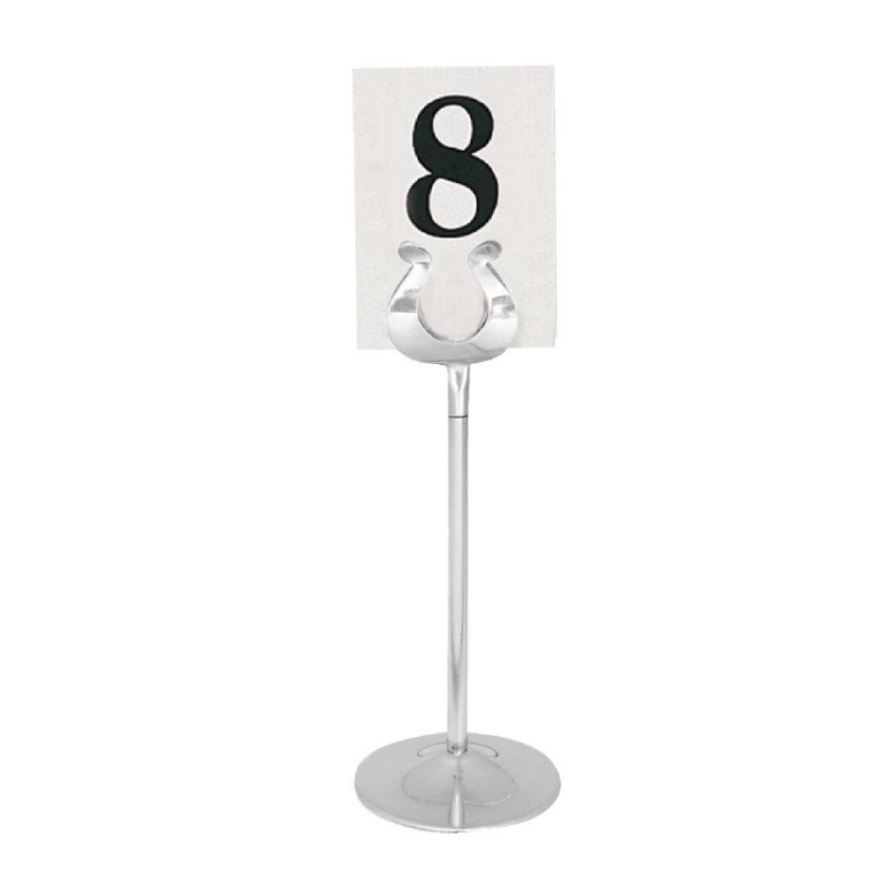 A stainless steel table number stand which is ideal for holding the plastic table numbers GC086 and GB629 just what you need for clear identification of your tables.