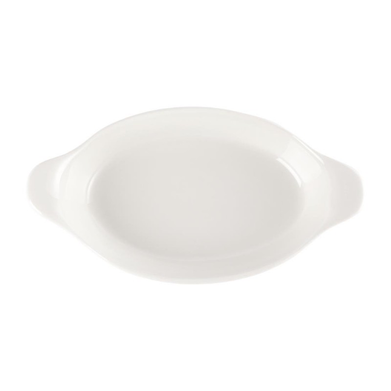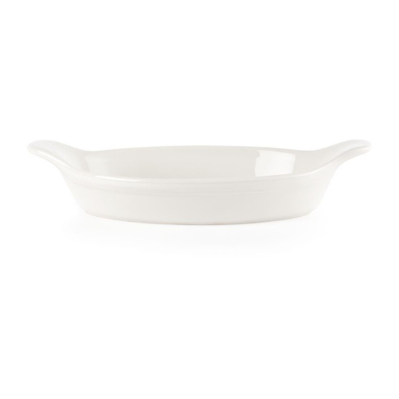 Specifically designed to withstand the rigours of the busy catering environment this readily available range of appealing oven-to-tableware 9x 5" oval-eared dishes by Churchill are durable and chip resistant offering excellent heat retention properties.