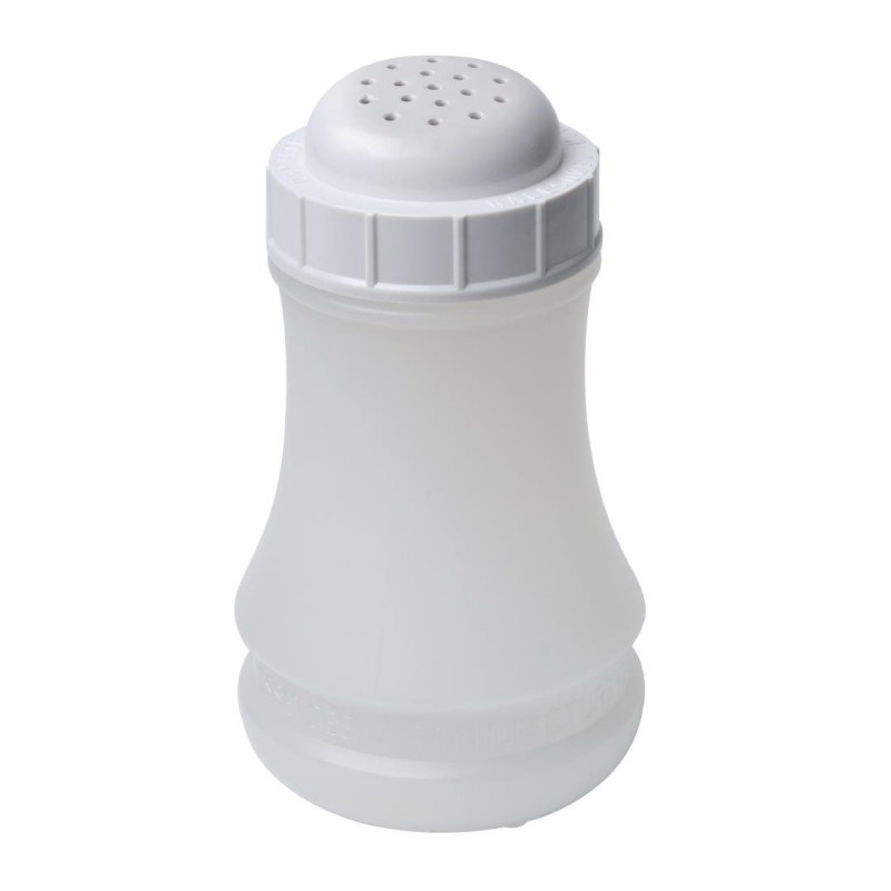 Large capacity plastic countertop salt shaker ideal for fish and chip restaurants.