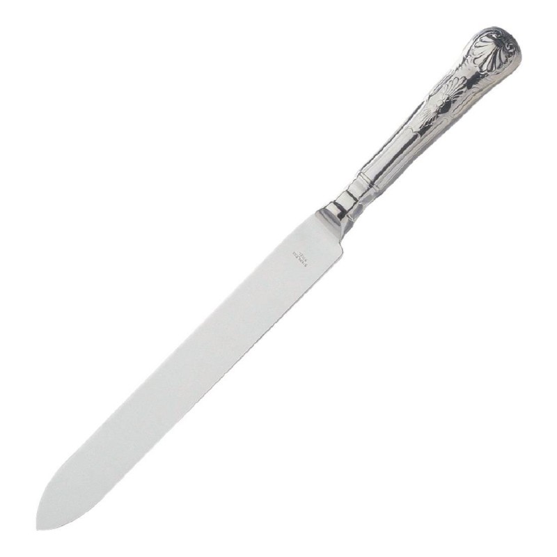 An attractive stainless steel wedding cake knife featuring the kings pattern on the hollow handle with a highly polished finish presented neatly in a gift box.