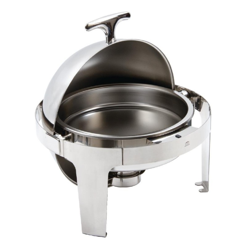 Paris chafing set features polished stainless steel round chafing dish with a roll top for ease of use. With stainless steel legs it comes supplied with 6 litre water pan food pan cover and fuel holder.