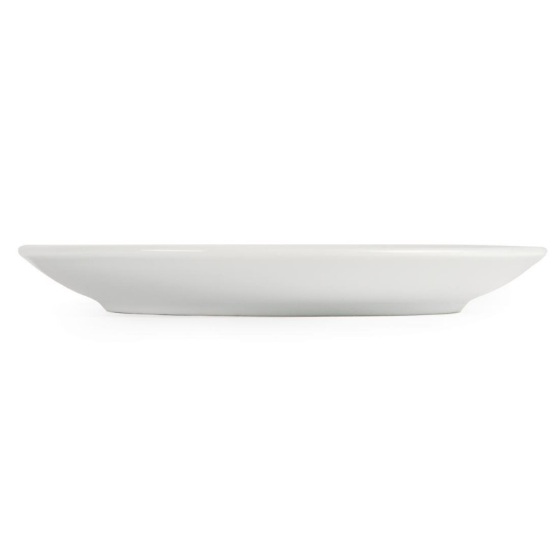 An appealing pure white 7" Coupe plate from Olympia designed to provide a great value and hardwearing porcelain crockery solution for busy hotels canteens casual dining restaurants and cafs. Strengthened rolled edges ensure the plate is chip resistant and the fully vitrified body gives great glaze durability making it ideal to withstand the rigours of the professional catering environment. The plate is stackable helping maximise storage space and oven microwave dishwasher and freezer proof. This item is guaranteed by the Nisbets Edge Chip Warranty.