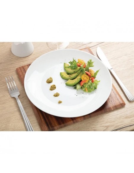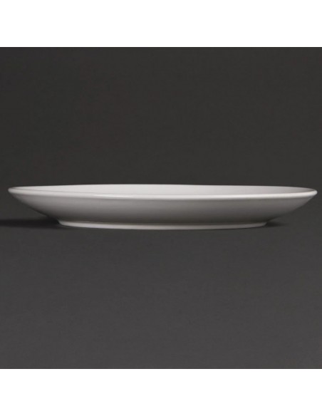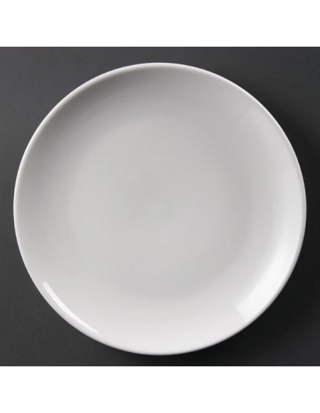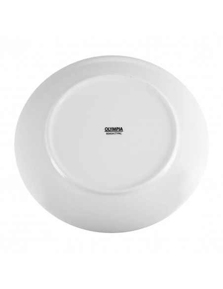 An appealing pure white 10" Coupe plate from Olympia designed to provide a great value and hardwearing porcelain crockery solution for busy hotels canteens casual dining restaurants and cafs. Strengthened rolled edges ensure the plate is chip resistant and the fully vitrified body gives great glaze durability making it ideal to withstand the rigours of the professional catering environment. The plate is stackable helping maximise storage space and oven microwave dishwasher and freezer proof. This item is guaranteed by the Nisbets Edge Chip Warranty.