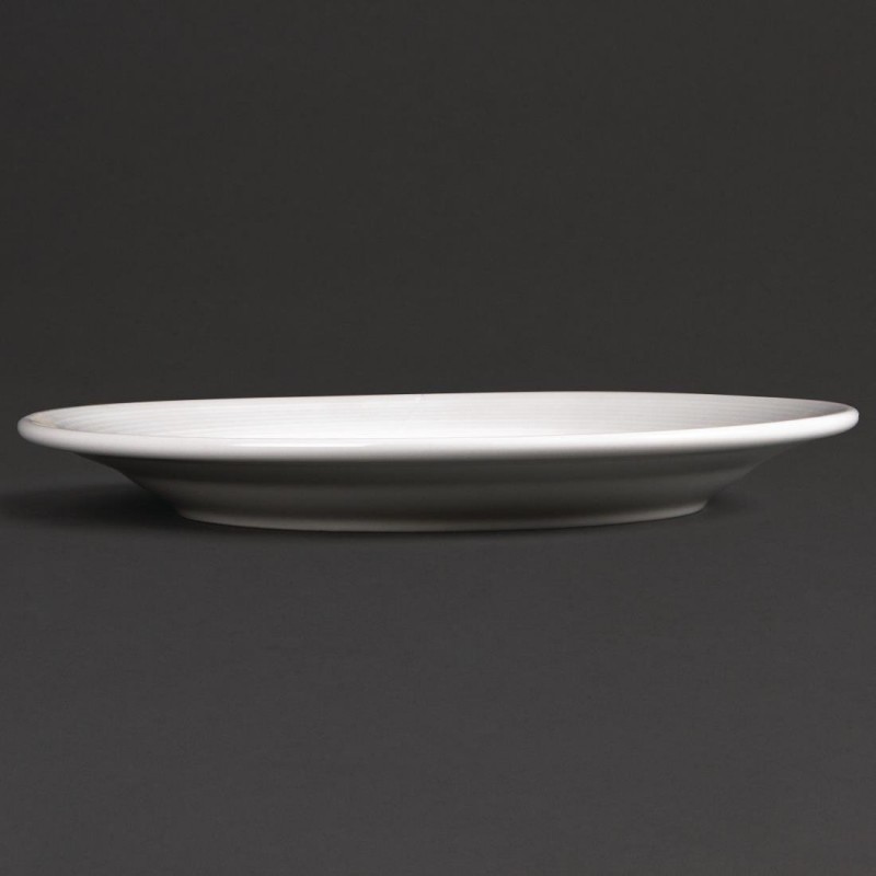 This modern style wide-rimmed plate from the Linear range by Olympia is made from plain white porcelain and features a delicately embossed lined pattern. The dinner plate is fully vitrified giving excellent heat and shock resistance and glaze durability making it robust and able to withstand the rigours of a professional catering establishment. This item is guaranteed by the Nisbets Edge Chip Warranty.