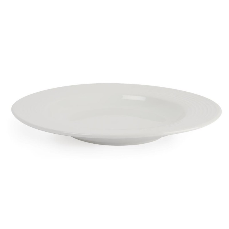 This stylish 1 pasta plate from the Linear range by Olympia is made from plain white porcelain and features a delicately embossed lined pattern. The plate is fully vitrified giving excellent heat and shock resistance and glaze durability making it robust and able to withstand the rigours of a professional catering establishment. This item is guaranteed by the Nisbets Edge Chip Warranty.