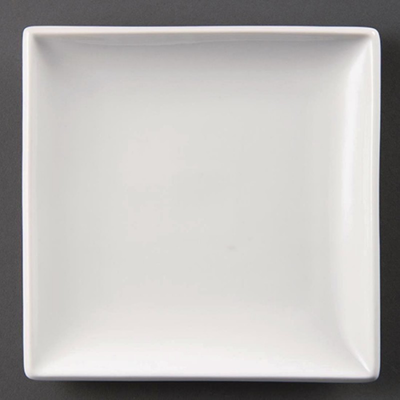 An appealing pure white 1 square plate from Olympia designed to provide a great value and hardwearing porcelain crockery solution for busy hotels canteens casual dining restaurants and cafs. Strengthened rolled edges ensure the plate is chip resistant and the fully vitrified body gives great glaze durability making it ideal to withstand the rigours of the professional catering environment. The plate is stackable helping maximise storage space and oven microwave dishwasher and freezer proof.