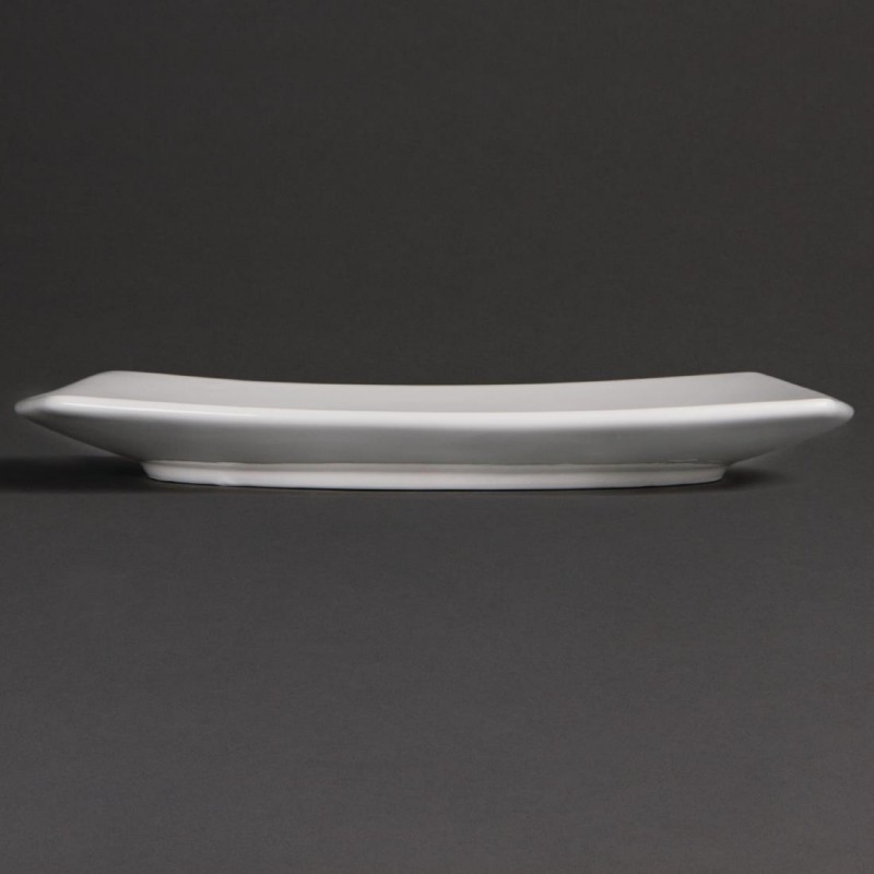 An appealing pure white rounded square plate from Olympia designed to provide a great value and hardwearing porcelain crockery solution for busy hotels canteens casual dining restaurants and cafs. Strengthened rolled edges ensure the plate is chip resistant and the fully vitrified body gives great glaze durability making it ideal to withstand the rigours of the professional catering environment. The plate is stackable helping maximise storage space and oven microwave dishwasher and freezer proof.