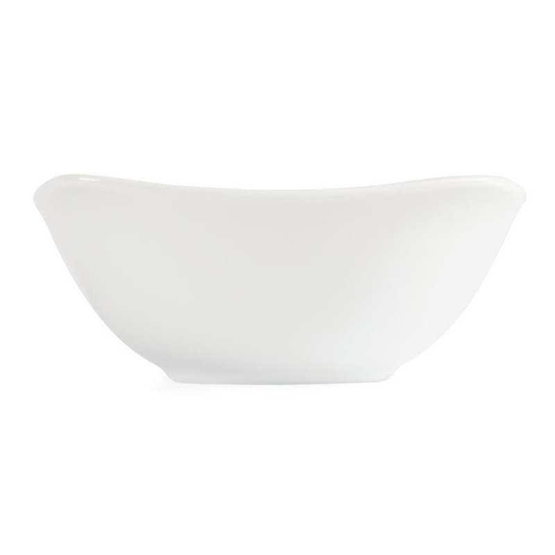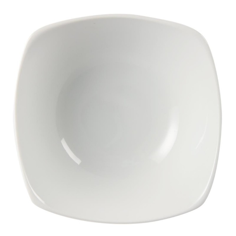 An appealing pure white rounded square bowl from Olympia designed to provide a great value and hardwearing porcelain crockery solution for busy hotels canteens casual dining restaurants and cafs. Strengthened rolled edges ensure the bowl is chip resistant and the fully vitrified body gives great glaze durability making it ideal to withstand the rigours of the professional catering environment. The bowl is stackable helping maximise storage space and oven microwave dishwasher and freezer proof.