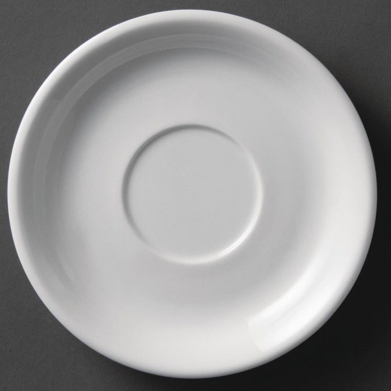 A pure white cappuccino saucer from Olympia designed to fit the 412ml cappuccino cup U827 which provides a great value and hardwearing porcelain crockery solution for busy hotels canteens casual dining restaurants and cafs. Strengthened rolled edges ensure the coffee cup saucer is chip resistant and a fully vitrified body gives great glaze durability making it ideal to withstand the rigours of the professional catering environment. The saucer is stackable helping maximise storage space and is oven microwave dishwasher and freezer proof. This item is guaranteed by the Nisbets Edge Chip Warranty.
