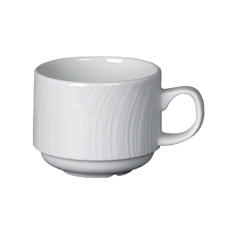 Combining contemporary forms with traditional finishing techniques this award-winning Spyro crockery has been individually styled with a delicate swirling embossed detail which lends a touch of sophistication to any professional catering environment from banqueting to fine dining. This 212ml stacking cup ensures elegance and style with hidden strength for lasting durability such as thermal shock and stain resistance as well as a robust glaze.