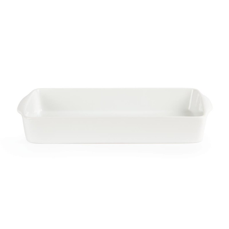 An oblong roasting dish from Olympia designed to provide a great value and hardwearing pure white porcelain crockery solution for busy hotels canteens and restaurants. Strengthened rolled edges ensure the dish is chip resistant and the fully vitrified body gives great glaze durability making it ideal to withstand the rigours of the professional catering environment. The roaster is oven microwave dishwasher and freezer proof.