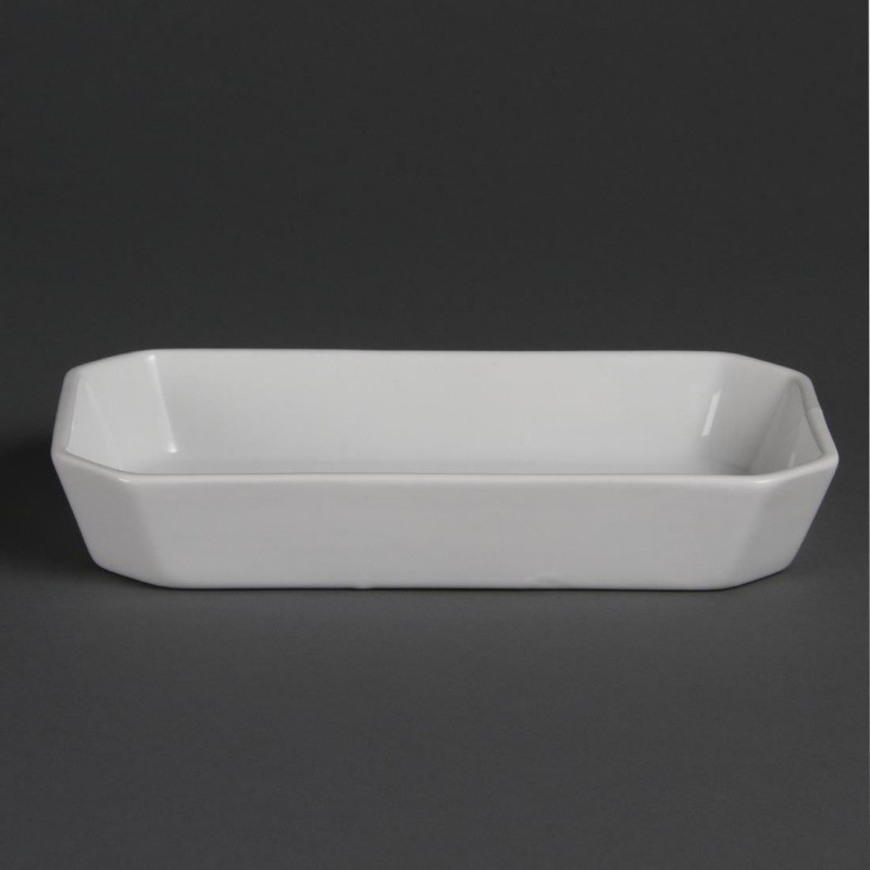 A welcome addition to any table this oblong hors d'oeuvre dish from Olympia is designed to provide a great value and hardwearing porcelain crockery solution for busy hotels canteens and restaurants. Strengthened rolled edges ensure the oblong dish is chip resistant and the fully vitrified body gives great glaze durability making it ideal to withstand the rigours of the professional catering environment. The dish is stackable helping maximise storage space and oven microwave dishwasher and freezer proof.