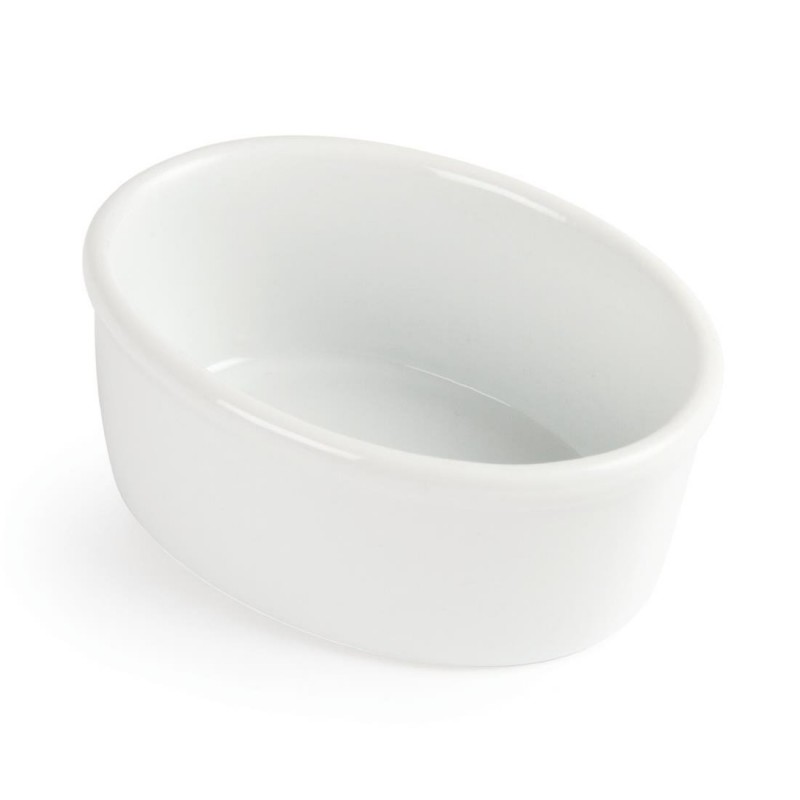 This white 4" oval ramekin from Olympia is designed to provide a great value and hardwearing porcelain crockery solution for busy hotels canteens casual dining restaurants and cafs. Strengthened rolled edges ensure the ramekin is chip resistant and the fully vitrified body gives great glaze durability making it ideal to withstand the rigours of the professional catering environment. The ramekin is oven microwave dishwasher and freezer proof.