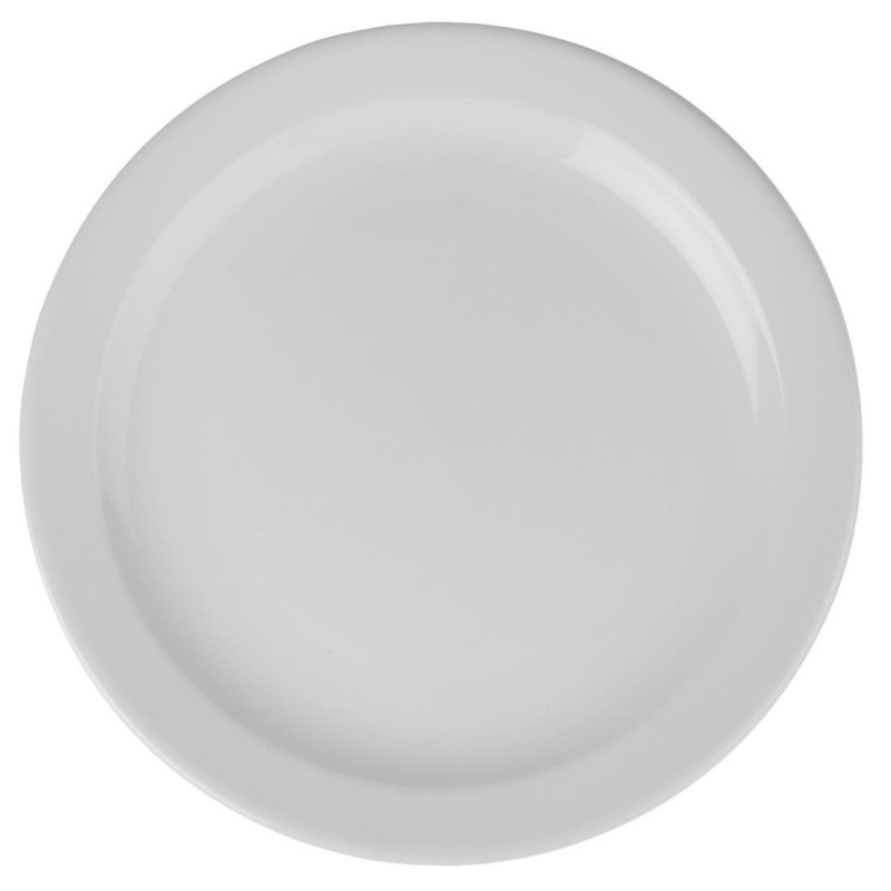Great value 10" porcelain narrow rimmed plates from Athena Hotelware which is tough functional and practical making this crockery range popular ideal for use in pubs canteens and bistros. This item is guaranteed by the Nisbets Edge Chip Warranty.