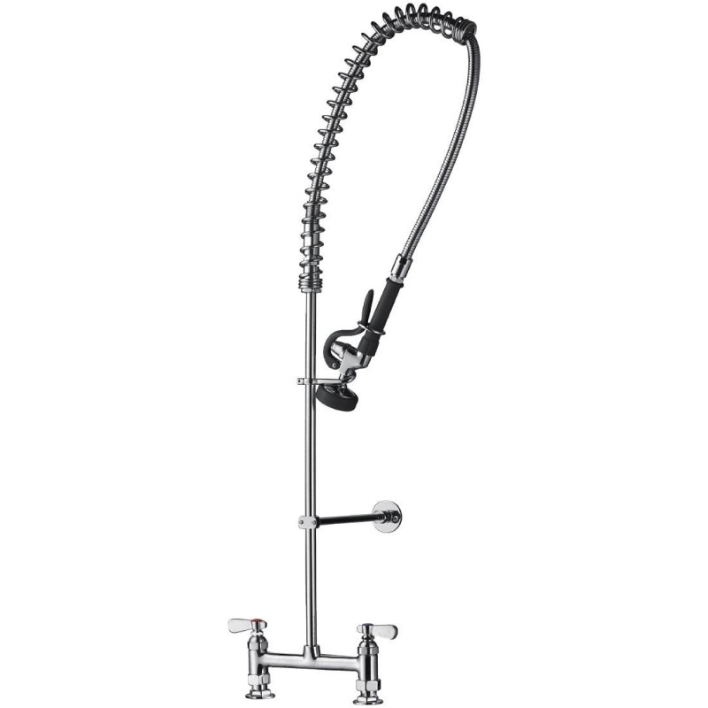 Rinse dishes and cookware before the dishwasher for maximum cleaning results. With a spring action gooseneck and turn ceramic cartridge to prevent leakage both pre-rinse units are robust & durable for frequent use. Pedestal twin water feed with mixer taps.