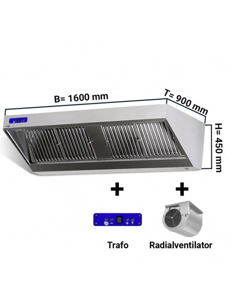 Designed specifically for gastronomy and heavy-duty cooking environments, this extraction hood delivers a powerful 1600 m³/h airflow, integrated motor, and three flame-resistant baffle filters to ensure clean, efficient air removal during demanding service hours.