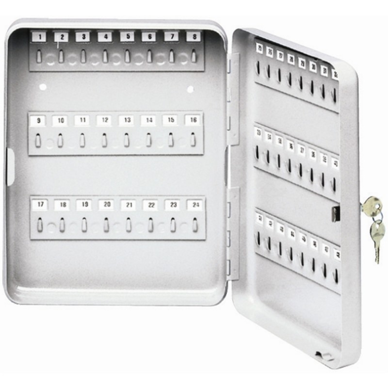 Lockable steel key box with capacity for 48 keys. Ready prepared for fixing to the wall bolts supplied.
