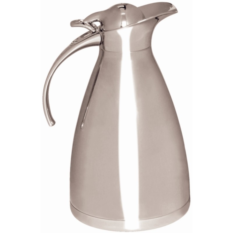 Attractive stainless steel vacuum jug with sealed hinged lid and double wall stainless steel body for improved heat retention.