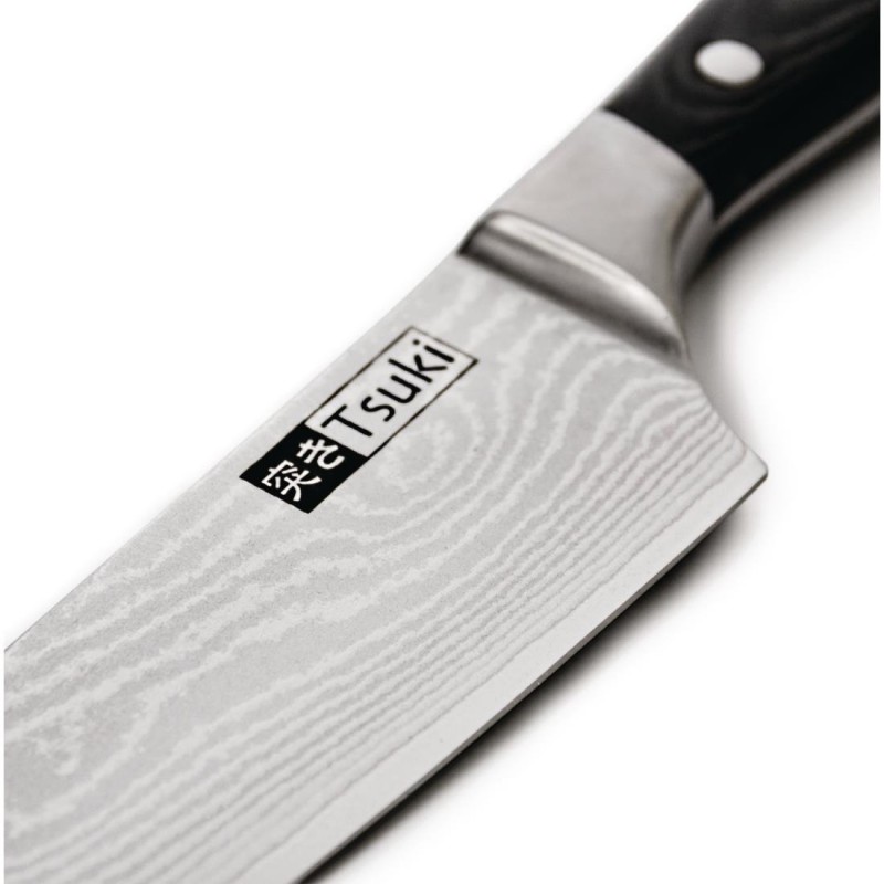 These Tsuki Japanese knives feature two layers of attractive Damascus steel covering the core of the knives to protect against corrosion. This set contains: 17cm (6.5") cleaver 20cm (8") chefs knife 18cm (7") Santoku knife 13cm (5") utility knife and 9cm (3.5") paring knife with a Vogue thirteen compartment wipe clean knife wallet for safe and easy transportation