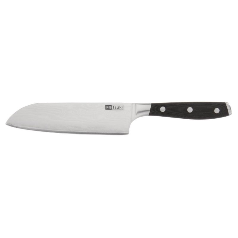 This classic Santoku knife features a Japanese VG-10 stainless steel core hardened up to 60 Rockwell rating providing great cutting performance for longer. Two layers of attractive Damascus steel cover the core to protect against corrosion. An ergonomic micarta resin handle provides excellent grip.