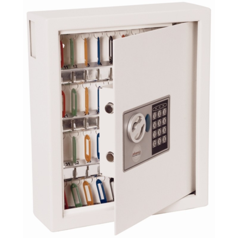 Heavy duty electronic safe with deposit slots so that keys may be deposited without opening the safe. Supplied with key rings and coloured fobs.