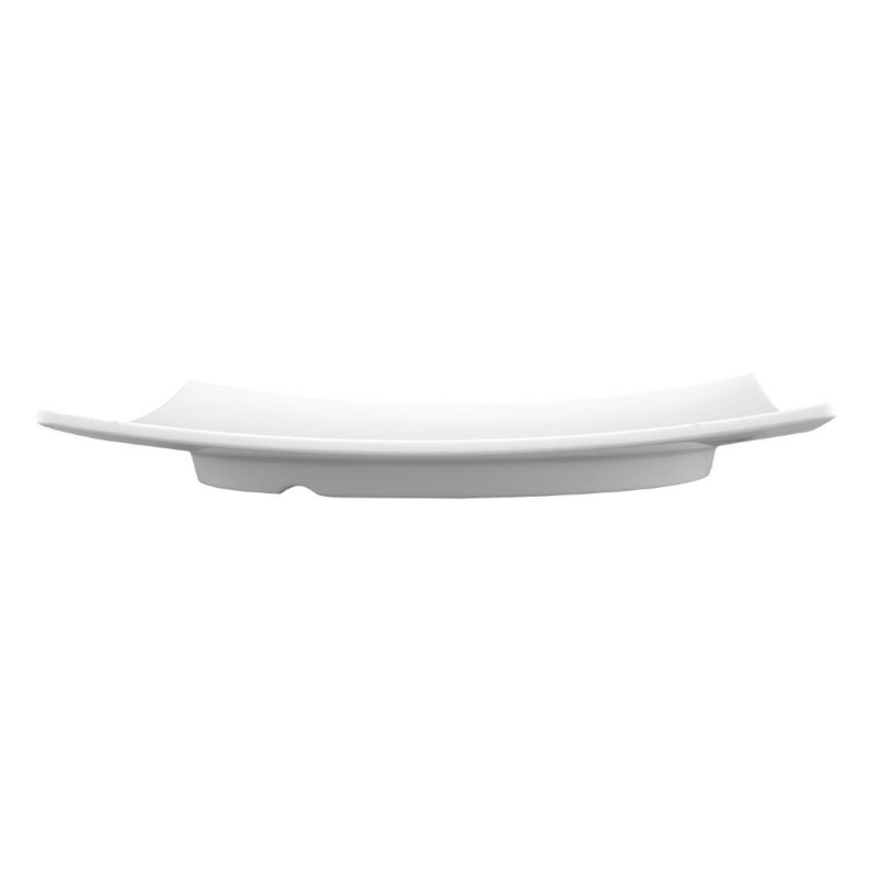Contemporary white melamine 12" plate by Kristallon featuring a striking curved square shape to help accentuate the food displayed suitable for display or service.