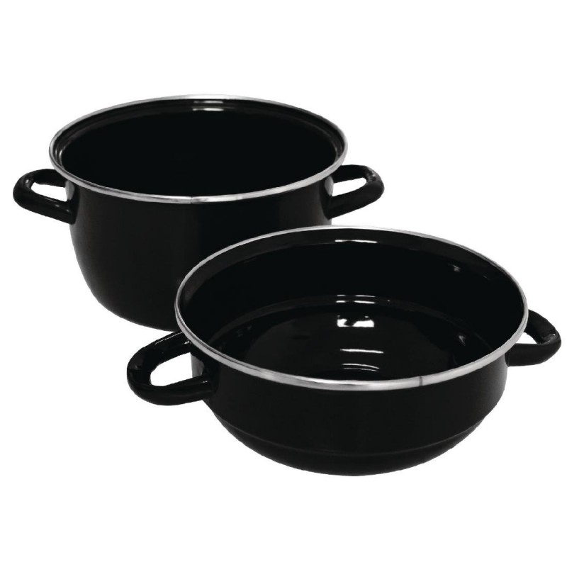 A black pot with handles and a stainless steel rim for stove to table use perfect for serving medium sized portions of steaming hot mussels to the table the lid can also be used for the disposal of shells.