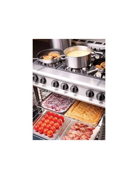 The Falcon 6 Burner Dominator Plus Range G3101 Natural Gas with Castors features high performance burners with cast iron pan supports and a general purpose oven. The removable stainless steel hob and vitreous enamelled gas oven chamber are both easy to clean as well as to use. The wide temperature range and five shelf positions make the range extremely versatile and the twin oven doors with individual catches helps retain heat increasing energy efficiency. The range also features laser etched control icons and low profile oven door handles for reduced intrusion into working space and is 2/1 Gastronorm compatible.