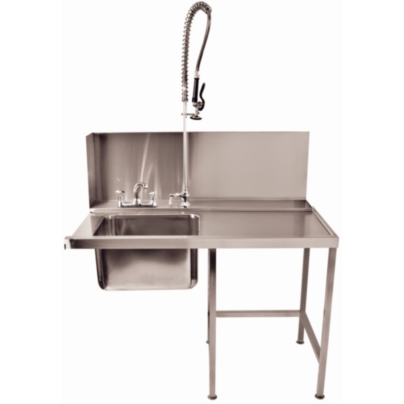 1100mm high pass-through inlet table with sink bowl splashback right hand pre-rinse spray and mixer taps.