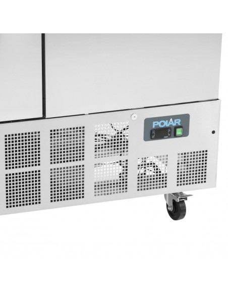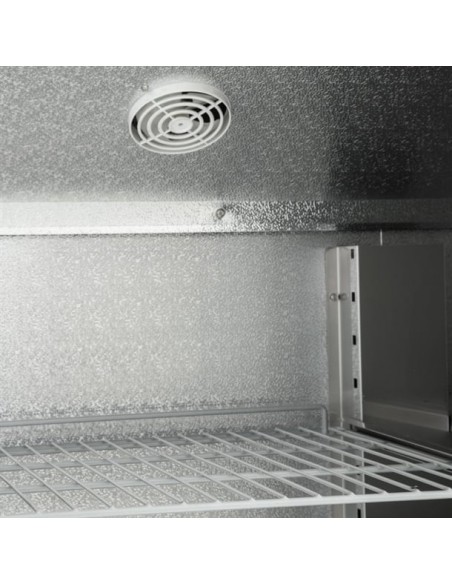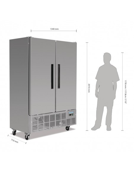 Slimline double door freezer ideal when access or space may be an issue. Bottom mounted refrigeration system draws air from the coolest part of the kitchen. Lockable with auto return doors for light to medium duty commercial kitchen and catering environments. Fully automatic controller.