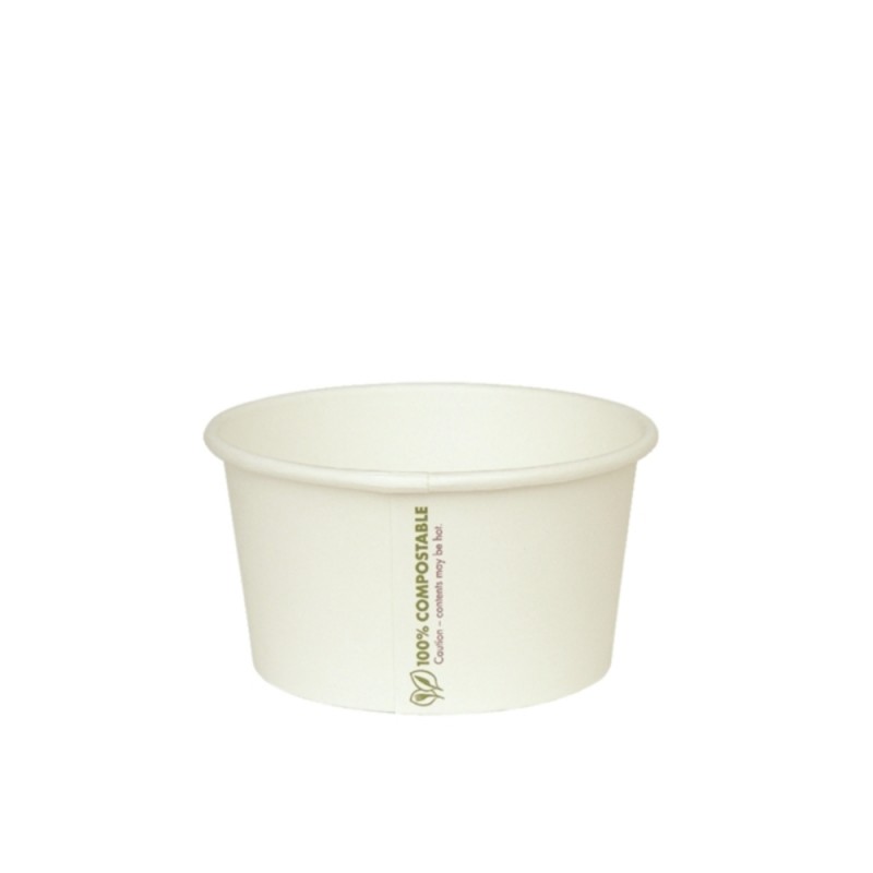 Completely compostable and stylish soup container by Vegware made from heavy weight PLA-lined sustainably sourced paper board. Suitable for both hot and cold foods such as soups stews porridge ice cream and frozen yogurts