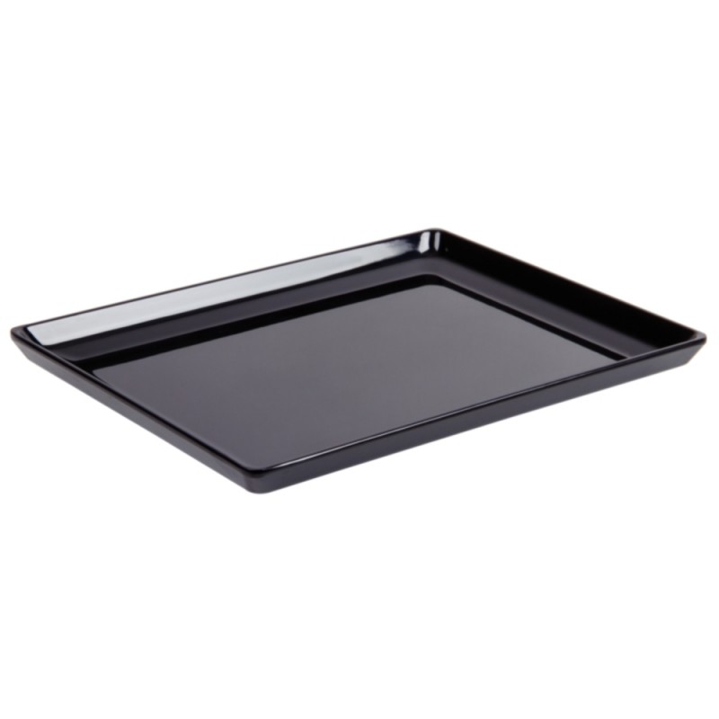 Elegant melamine APS black 1/1 GN tray from the Float range featuring a distinctive base which gives the impression of floating at the edge of the table. Its clear edges and smooth surfaces are combined with durability to achieve a timeless and classic appearance.