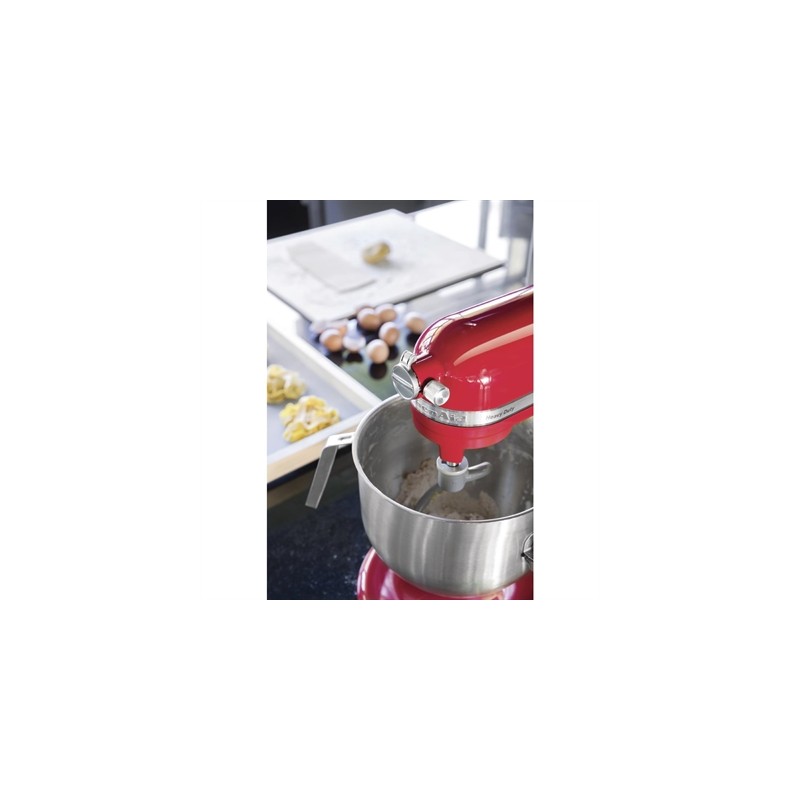 With its all-metal design and powerful yet quiet motor the KitchenAid Heavy Duty Mixer Red is reliable durable and efficient. It makes light yet quiet work of large batches and its unique planetary mixing action ensures all areas of the bowl are reached. As with every KitchenAid stand mixer the KitchenAid Heavy Duty Mixer also features a direct drive motor. This ensures that minimal power is lost between your power supply to the end KitchenAid attachment leaving the KitchenAid mixer as one of our most efficient economical powerful and quiet food mixers. Equipped with a pouring shield power hub for attachments such as the KitchenAid pasta maker and 500W motor with metal gears this mixer is strong enough to process large amounts of food whilst keeping noise levels low. This Heavy Duty KitchenAid mixer can for instance process 19 egg whites 1.9Ltr whipped cream 4.5kg cake mix 3.8kg dough and 3.6kg mashed potato in one sitting whilst its bowl lift design also ensures easy access to both bowl and accessories.