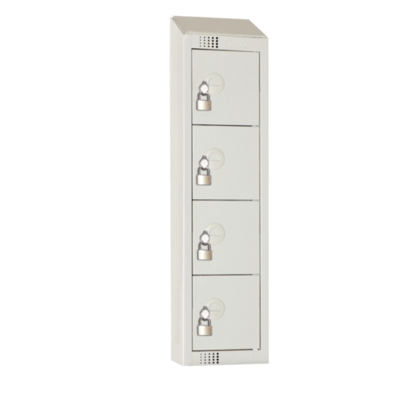 Four door lockers designed for use off floor. Anchor against a wall on a load bearing raised platform. Ideal for the storage of all personal effects including watches personal jewellery wallets purses and mobile phones.Internal dimensions: 168x 135x 180mm