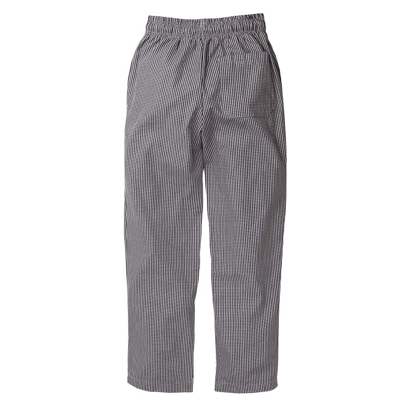 Simple stylish and durable unisex trousers (XXL) by Whites with an extra wide waistband for a more comfortable fit available in black and white check. These chef trousers are easy laundering with no buttons to break.
