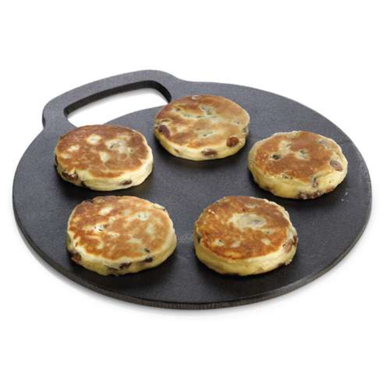 The traditional way of cooking bread based foods, scones and biscuits. The stone is made from cast iron allowing it to absorb moisture while cooking to create a perfect base every time. It also reduces hot spots to cook the food evenly wherever it is placed on the stone. With a integral handle for easy handling.