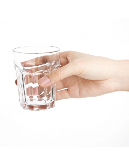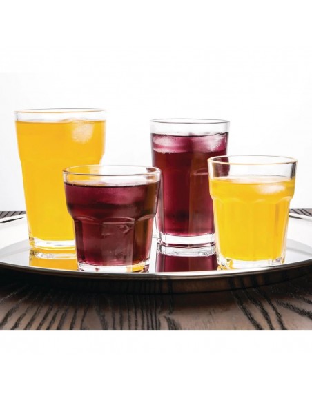 Classic panelled tumbler glasses suitable for use as orange juice glasses whiskey glasses or water glasses.