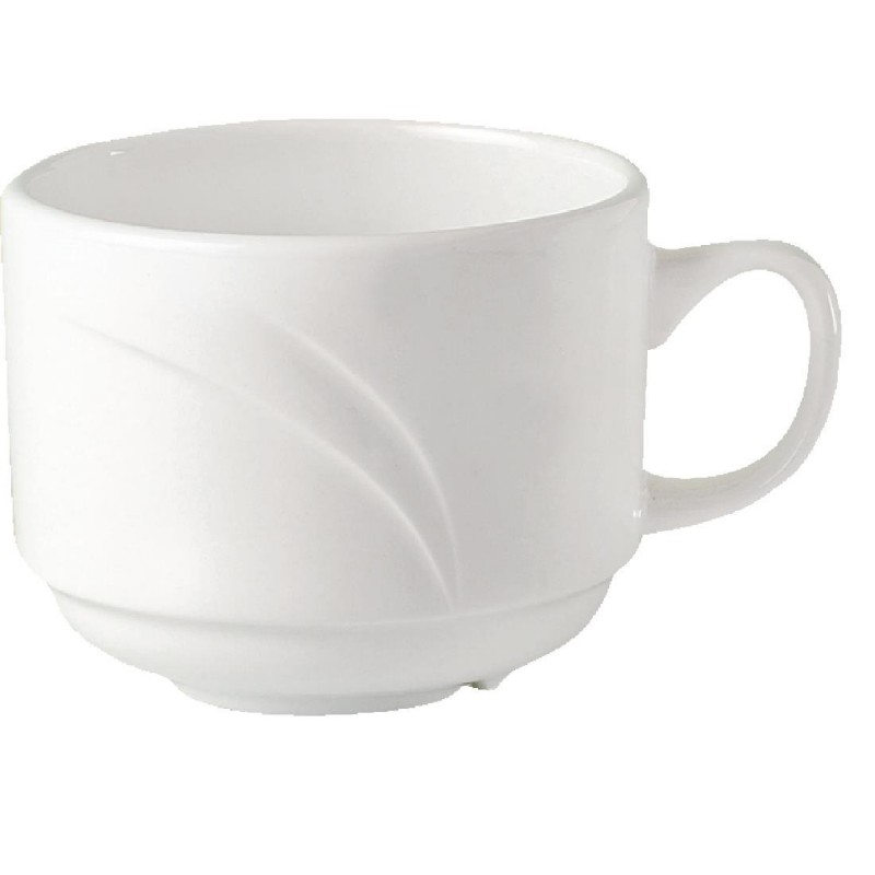 With flowing curves and a subtle embossment the Alvo crockery range assures outstanding food presentation to complement any cuisine.This 200ml stacking cup combines the pure white delicacy and translucence of finest china with exceptional durability with features including thermal shock and stain resistance and a robust glaze. (Matching saucer sold separately.)