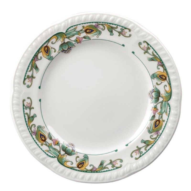 Elegant printed 7 ¼" plates by Churchill with a tropical floral design featuring the delicate embossment of the Buckingham shape featuring a durable glaze which provides an ultra smooth surface for presentation.