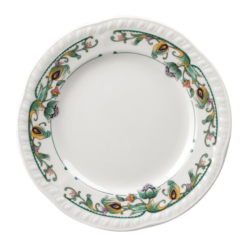 Elegant printed 6 ½" plates by Churchill with a tropical floral design featuring the delicate embossment of the Buckingham shape featuring a durable glaze which provides an ultra smooth surface for presentation.