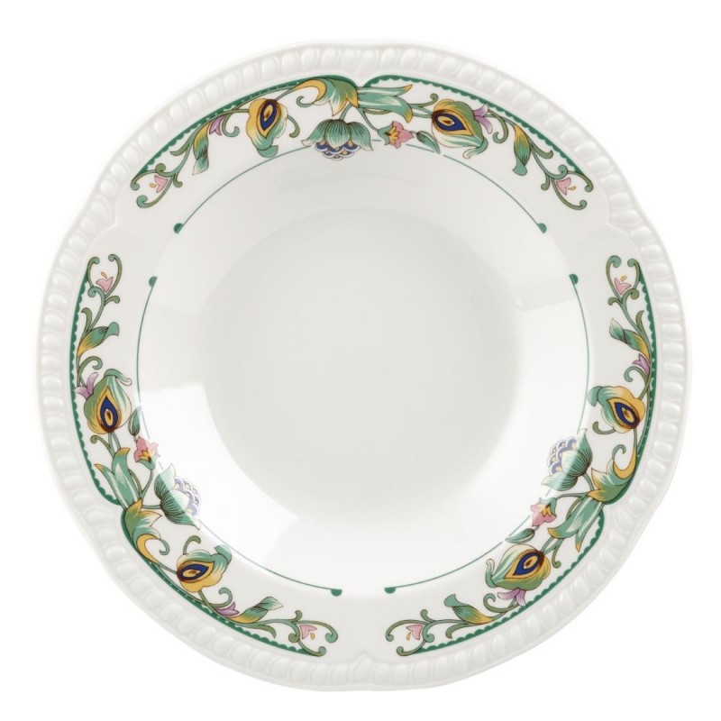 Elegant printed soup bowls by Churchill with a tropical floral design featuring the delicate embossment of the Buckingham shape featuring a durable glaze which provides an ultra smooth surface for presentation.