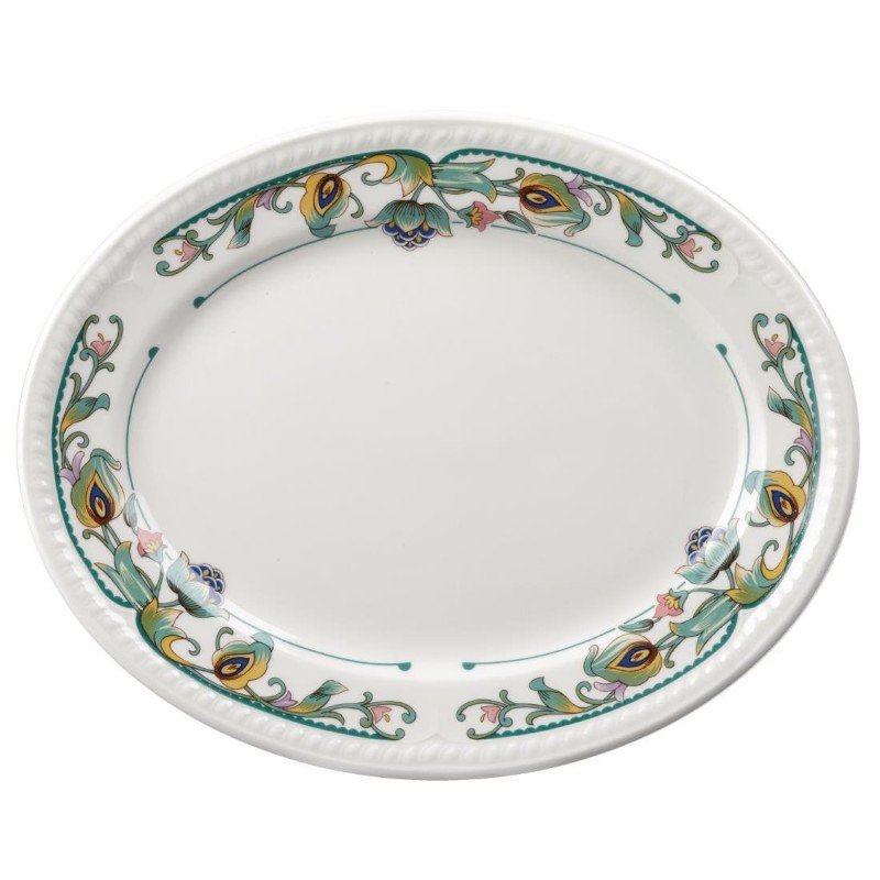 Elegant printed oval 12" platters by Churchill with a tropical floral design featuring the delicate embossment of the Buckingham shape featuring a durable glaze which provides an ultra smooth surface for presentation.